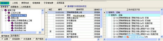 4.完美紧凑的清单法框架结构,清单编制一目了然:中部显示清单编制窗口,右侧显示项目特征和工作内容窗口,下部显示查询、人材机、费用构成等子页面,左侧可以显示章节切换窗口。