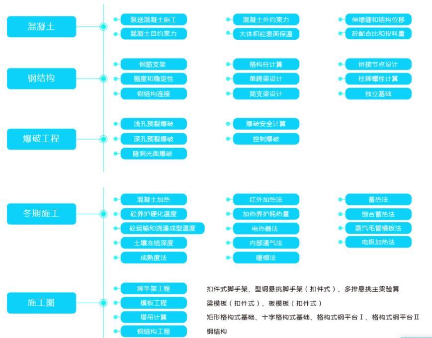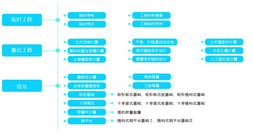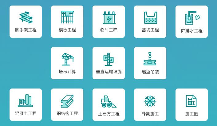 品茗建筑云安全计算软件包含脚手架工程、模板工程、临时工程、爆破工程、塔吊计算、降排水工程、起重吊装、冬期施工、混凝土工程、钢结构工程、基坑工程、垂直运输设施、施工图13大计算模块,157个计算单元。